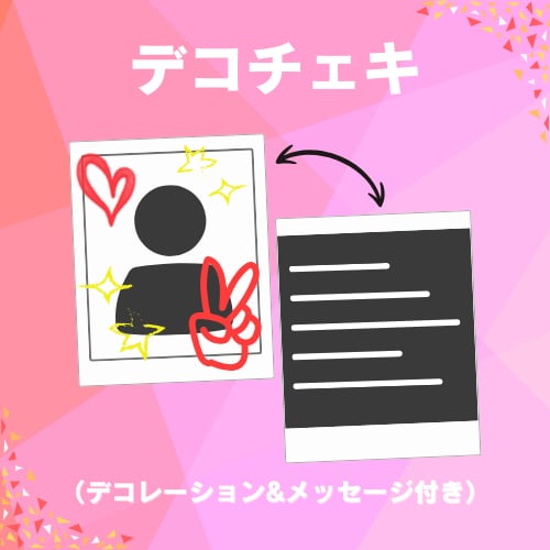 お目当てのタレントが映る”あなただけの”撮りおろしチェキを1枚、表の写真面にはメンバーが直筆のデコレーションを施し、裏面にはメッセージを記入のうえ送付いたします。